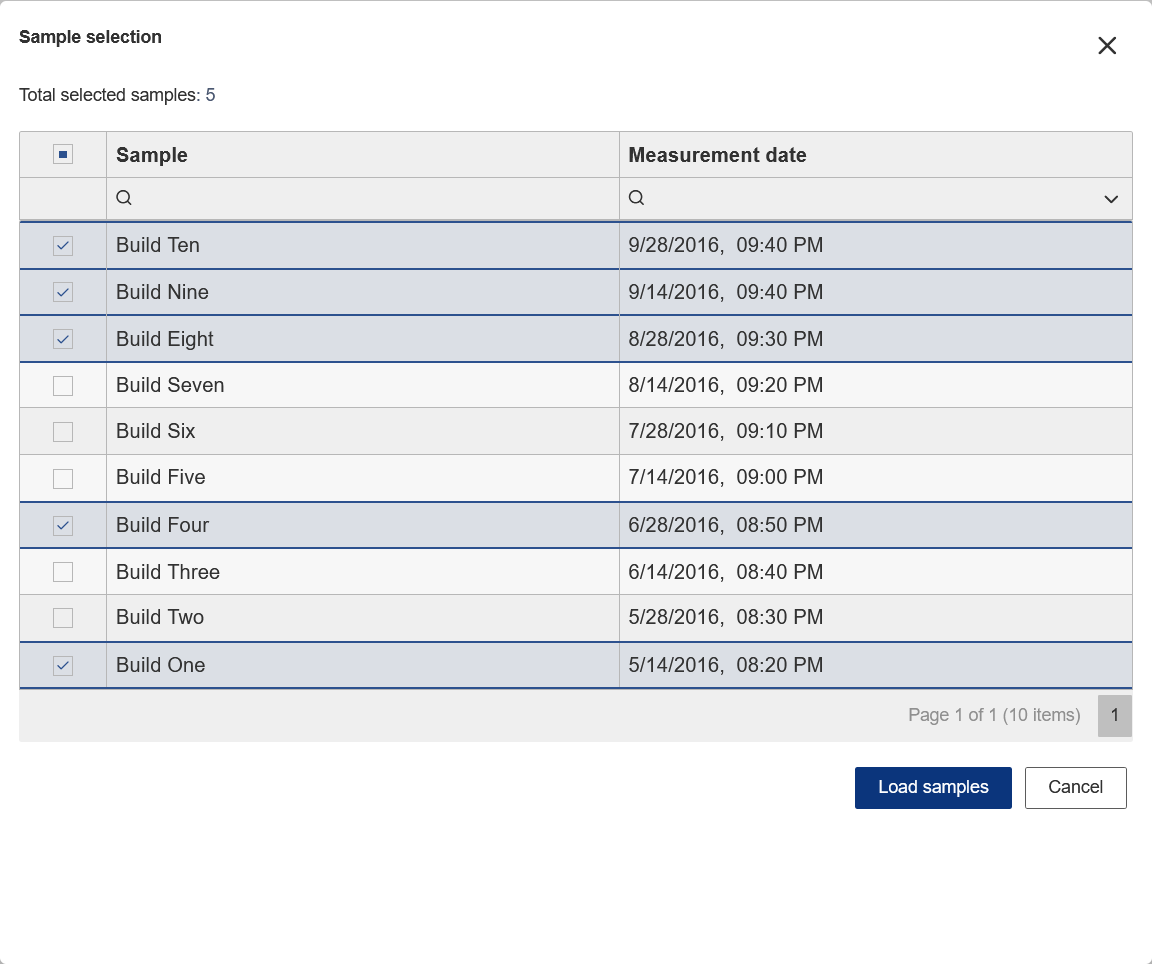 The samples that can be selected are displayed in a grid and based on the load type and any configured samples filters.
