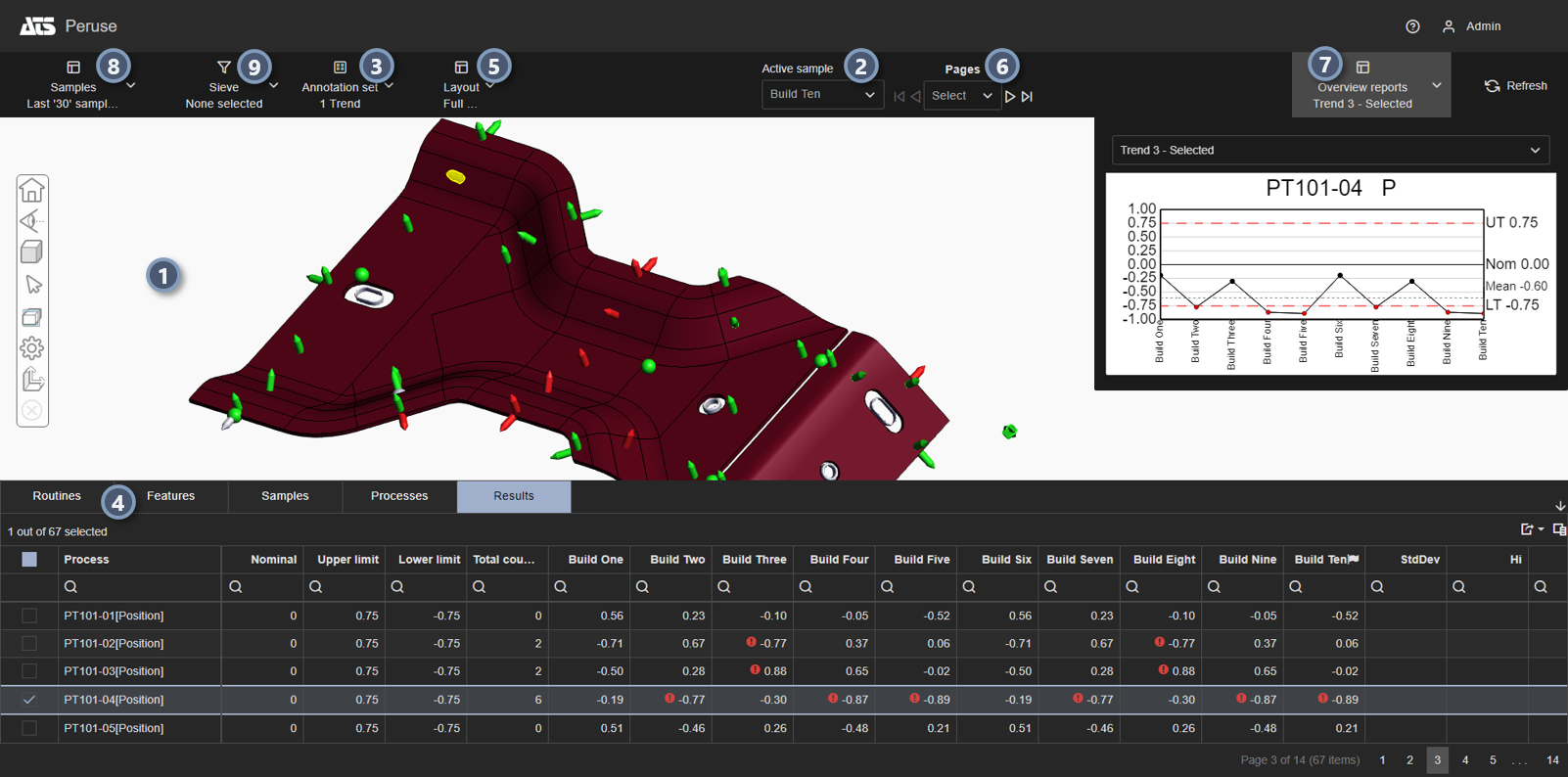 The selected Sample which determines what measurement data is used to populate the Summary Report and color-codes the Feature Markers on the 3D Model. There are additional indicators in the Trend Report and the Grids which also indicate the Active Sample. By default, the most recent Sample is set as the initial Active Sample.