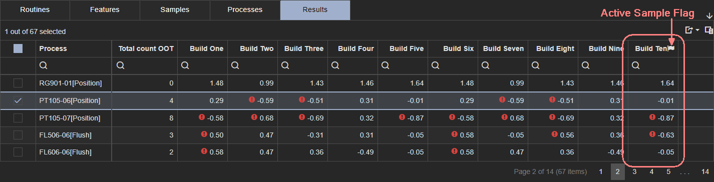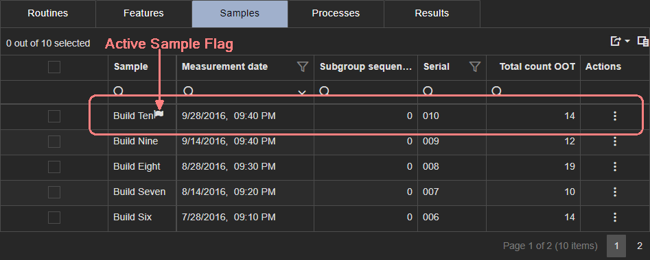 The Active Sample determines what measurement data is used to populate the Summary Report and color-codes the Feature Markers on the 3D Model. There are additional indicators in the Trend Report and the Grids which also indicate the Active Sample. By default, the most recent Sample is set as the initial Active Sample.