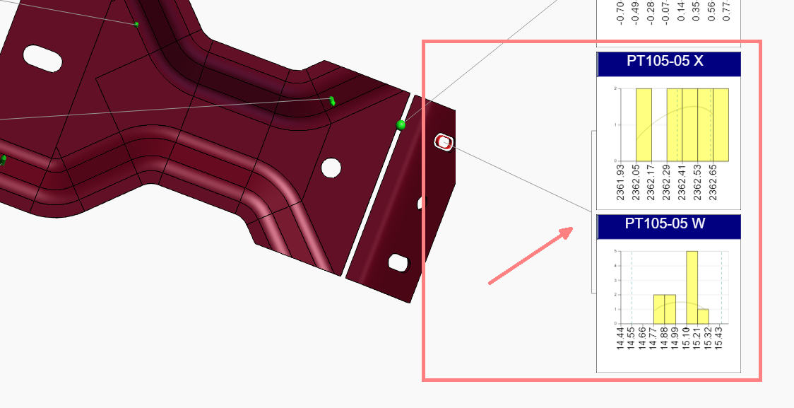 Annotations for characteristics from the same Feature in certain positions on the same page may share a leader line to the feature marker in the 3D View.