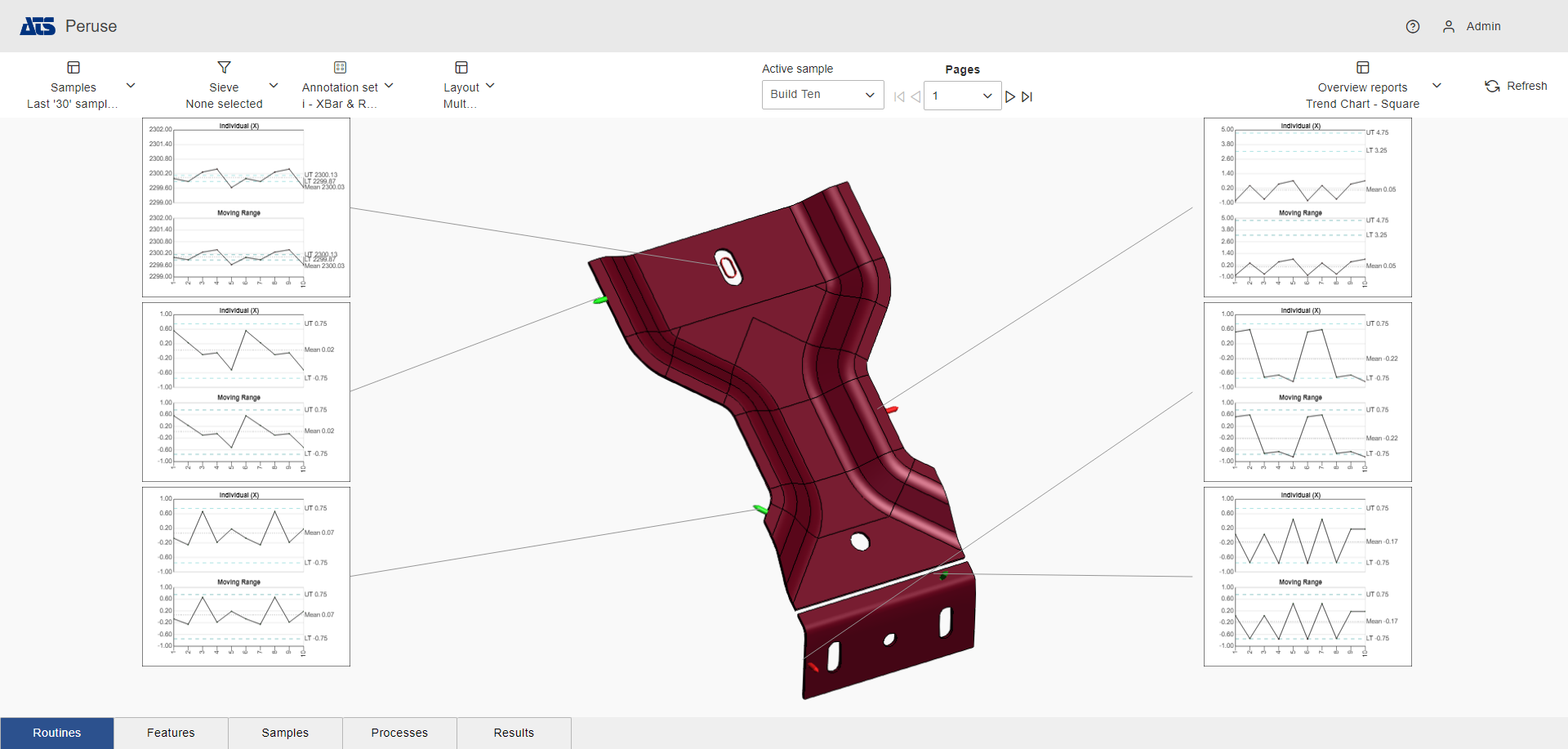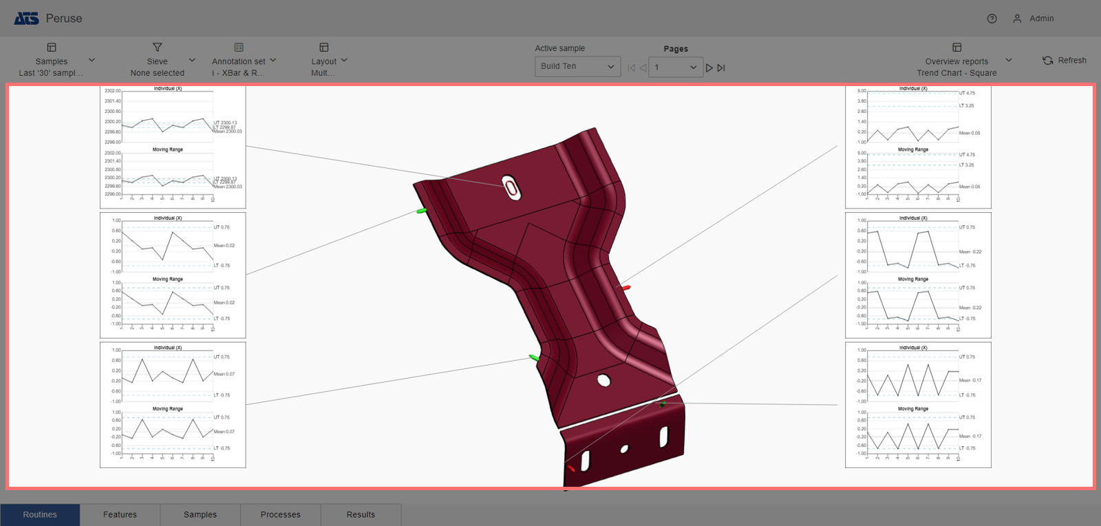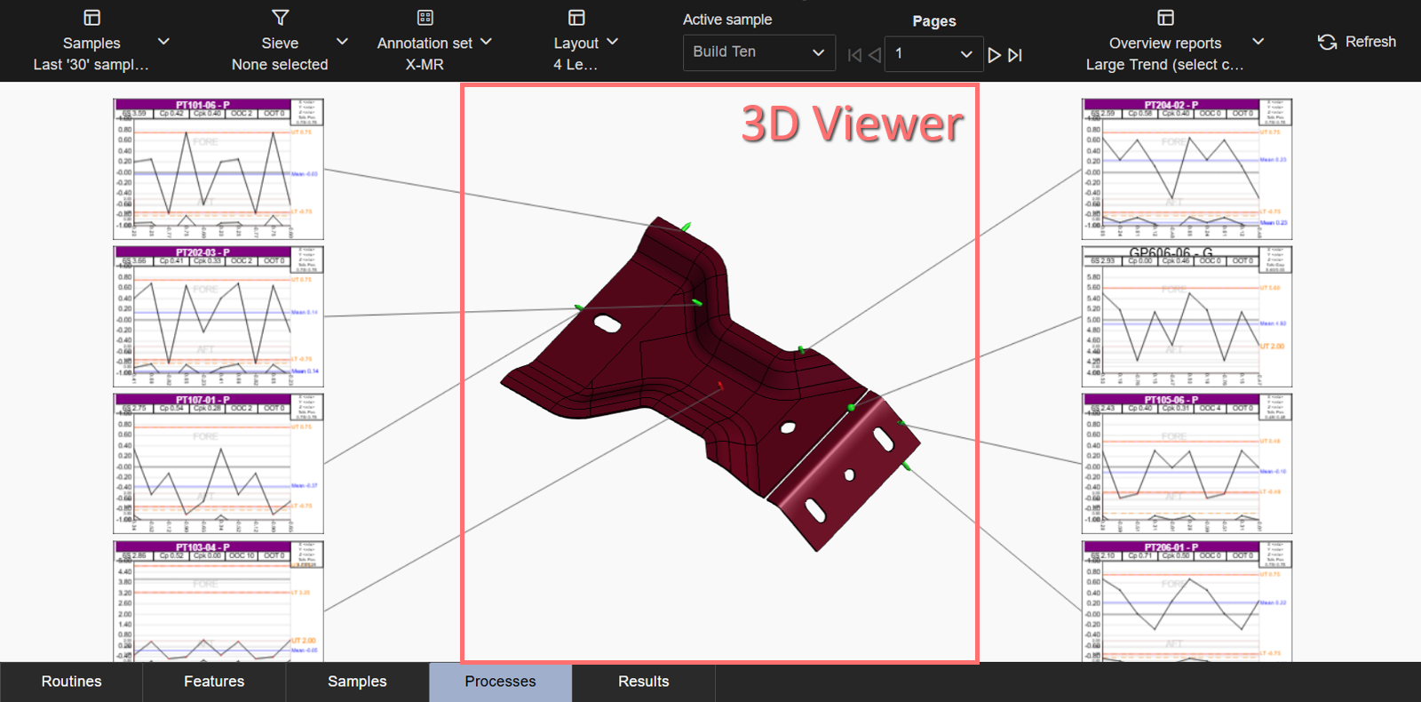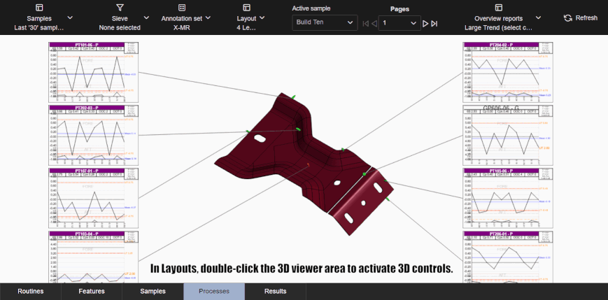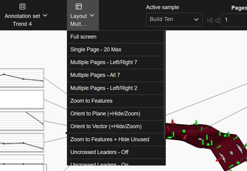Layouts are predefined configurations of annotations (charts/graphs) connected by leader lines to feature markers on a 3D model in a central viewer area. Changes to data selection or model adjustment result in immediate updates to the layout contents, including redrawing of leader lines and annotation ordering. The type/style of the annotations in the layout is determined by the selected Annotation Set.