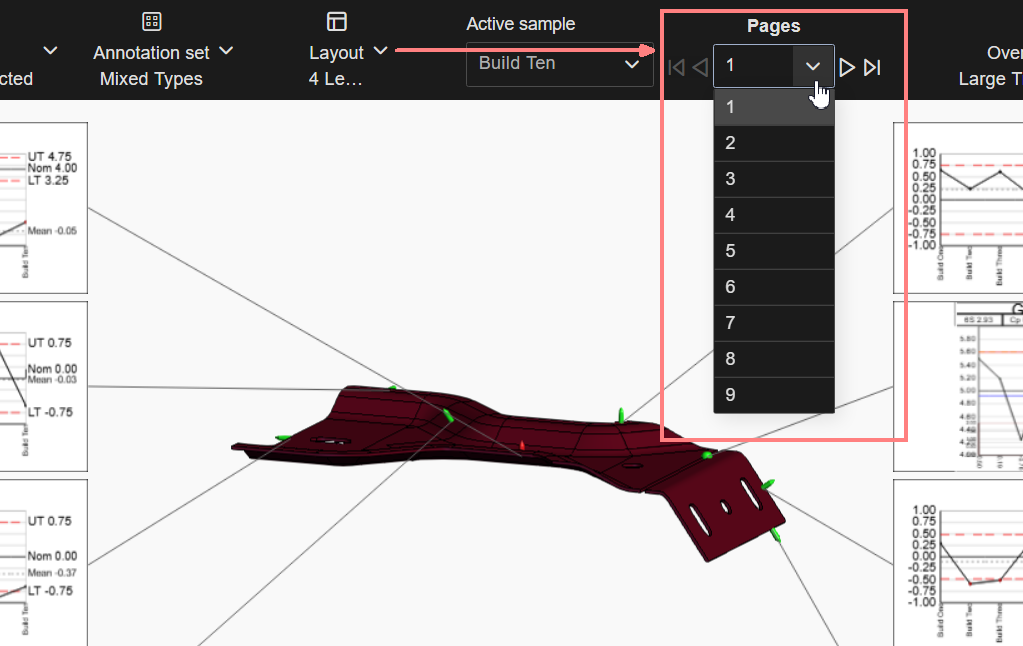 When a Layout has more annotations than can fit on just one page, the Pages toolbar is enabled for navigation between pages. Select another page by clicking the directional arrow or picking the page number from the dropdown. |