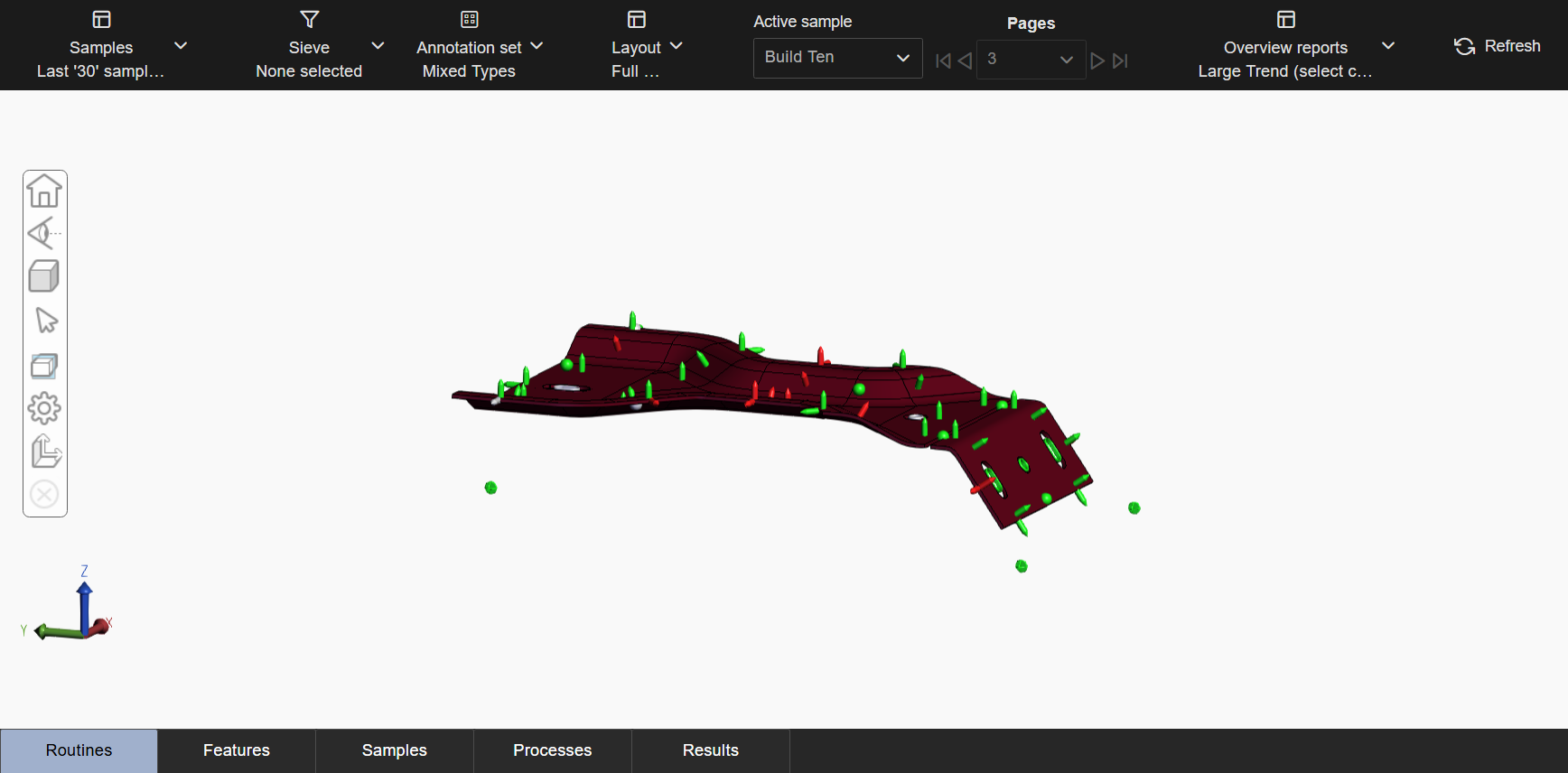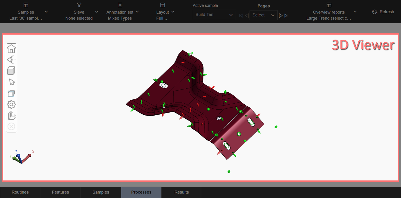 A full screen option is provided as a system default, where the 3D Viewer fills the screen area and no annotations are displayed. This layout cannot be deleted or modified, but you can create a custom Layout and designate that layout as the default on load. It is used when the 3D model is the primary focus or to open individual annotations rather than annotations for the complete set of data.
