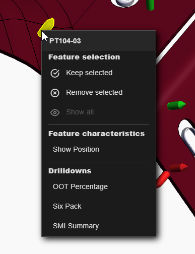 Annotations with more detailed information for a Feature can be opened by right-clicking on a feature marker in the 3D viewer and selecting a characteristic from the menu. The menu is dynamic, based on the feature selected. If multiple markers overlap one another, you are given the option to choose which of the markers to select for the menu options. If a feature has multiple characteristics, you can choose to open an annotation or a drilldown for individual characteristics, or annotations for all characteristics. The annotation popups can be dragged into a different position in the viewer area. Zooming in or out on the model also zooms the annotation. Annotation may be resized with the Annotation Scale option in the Viewer toolbar.