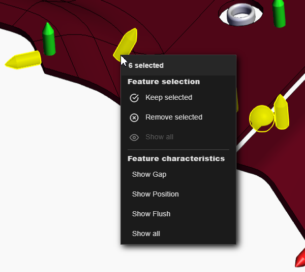 The data displayed in the 3D viewer can be filtered by selecting feature markers to keep or to remove. The corresponding data rows are also hidden in the grid. The removed data is still loaded, but is hidden (in grids, 3D model, reports). All data can be shown again at any point.