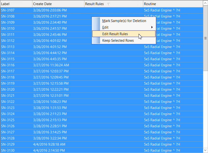 The Results Rule Sample field in DataUtility allows you to manage the Results Rules for measurement data that is in the database. In most cases multiple Samples will be assigned the same rule, but you can select individual Samples to assign rules as well.