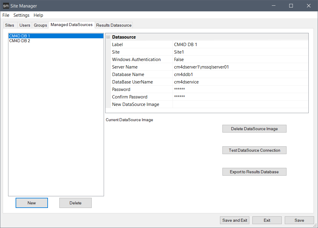 | New DataSource Image | Select an image to assign to the database, to visually identify the Managed DataSource. To see the image in the Current DataSource Image area, click Save. Once it is saved, the image is stored in the database and the original file path is deleted. |