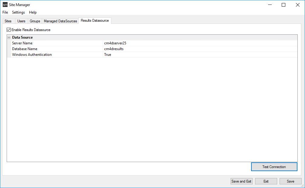 The Results Datasource tab is where you manage the connection information to your Results database. This connection information is used by the Results Loader and Results Database Utility to connect to the Results database. Only one Results database is permitted.