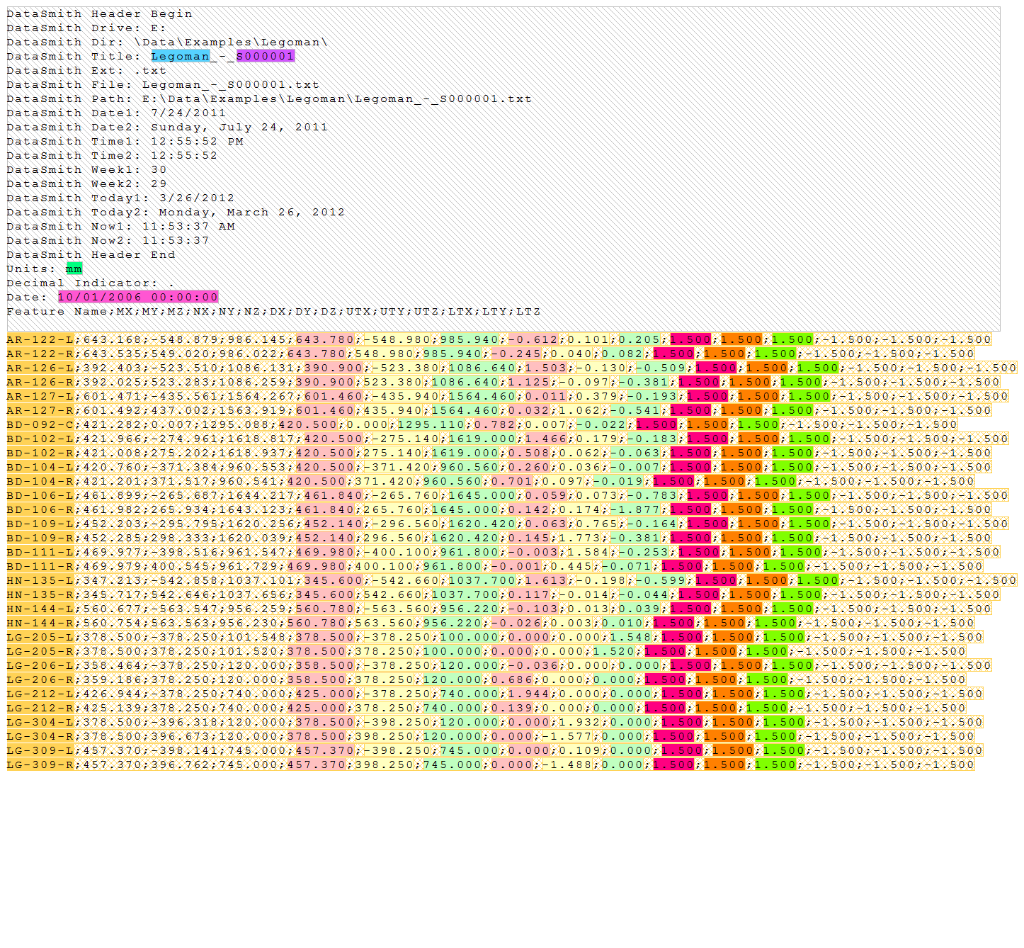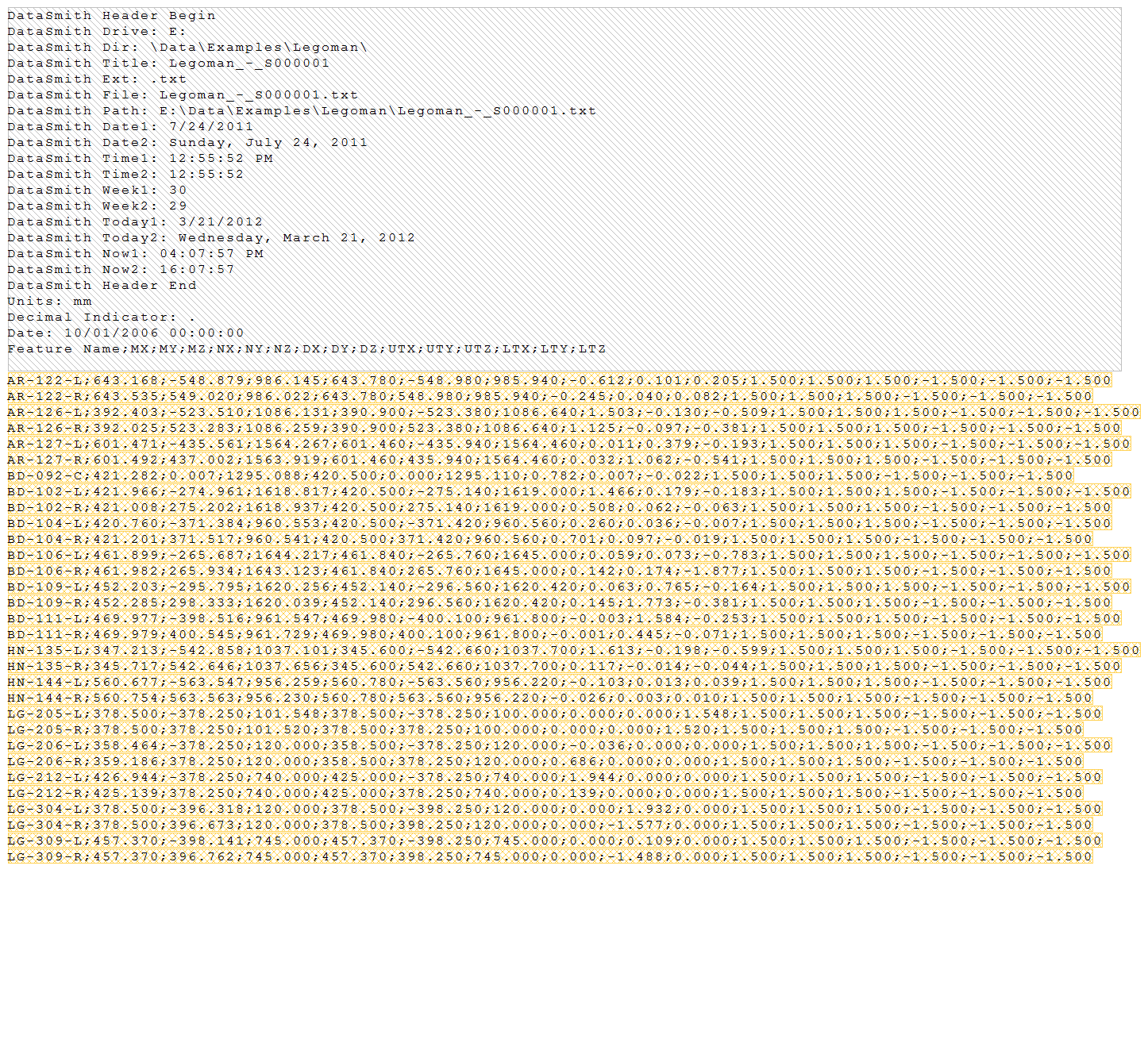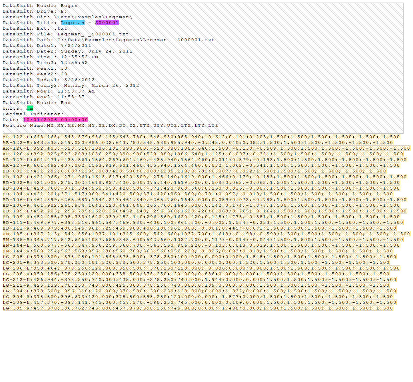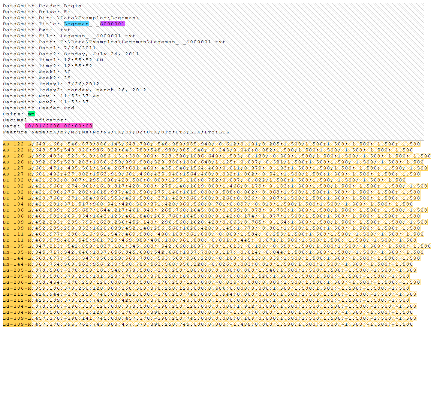 Below are screen captures of what the file highlighting and the grid in DataSmith will look like once all of the steps have been completed for the Legoman configuration. Compare the screen captures to your finished results to confirm that all of the steps were completed successfully.