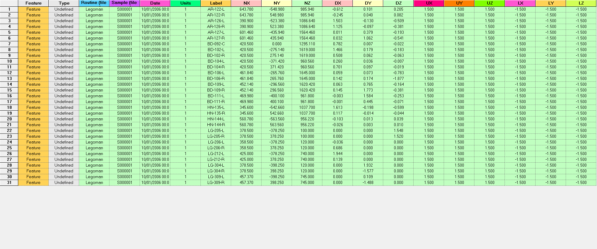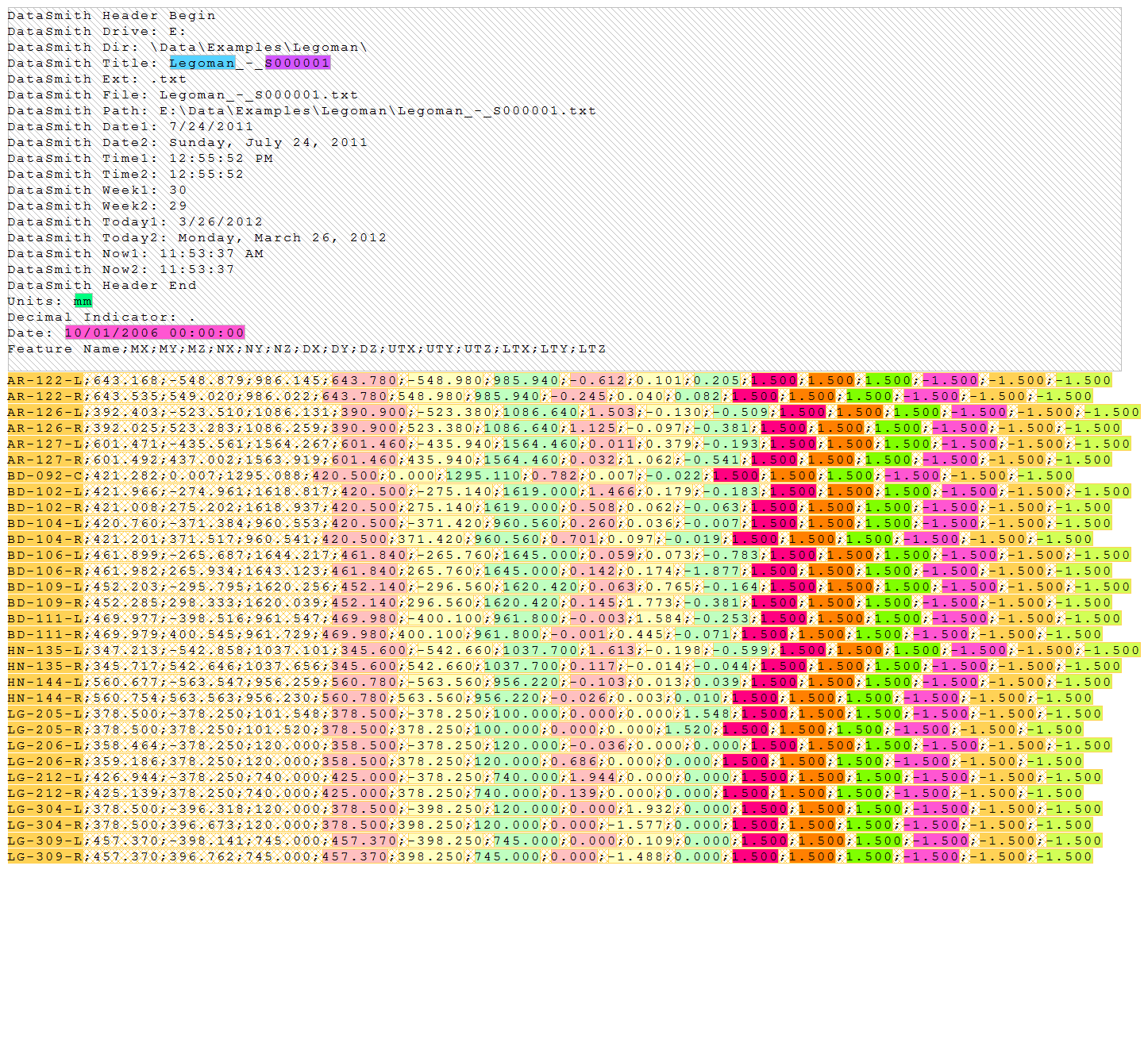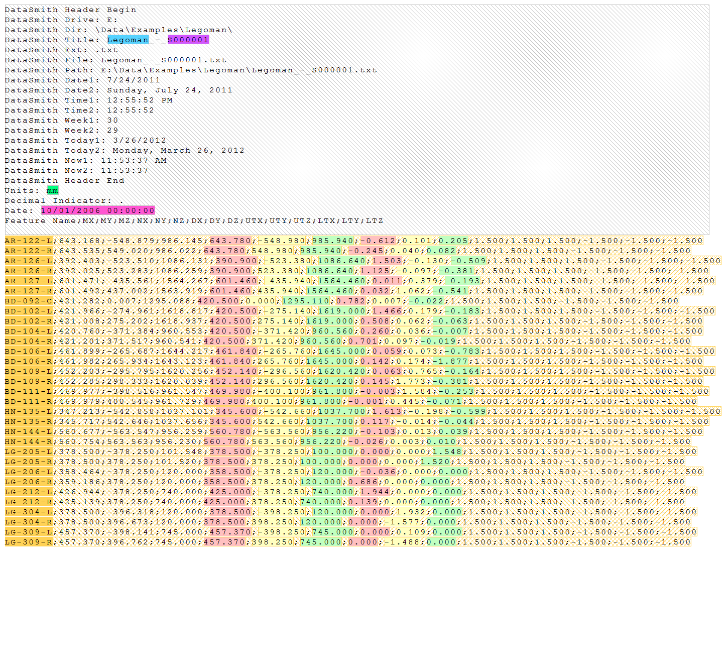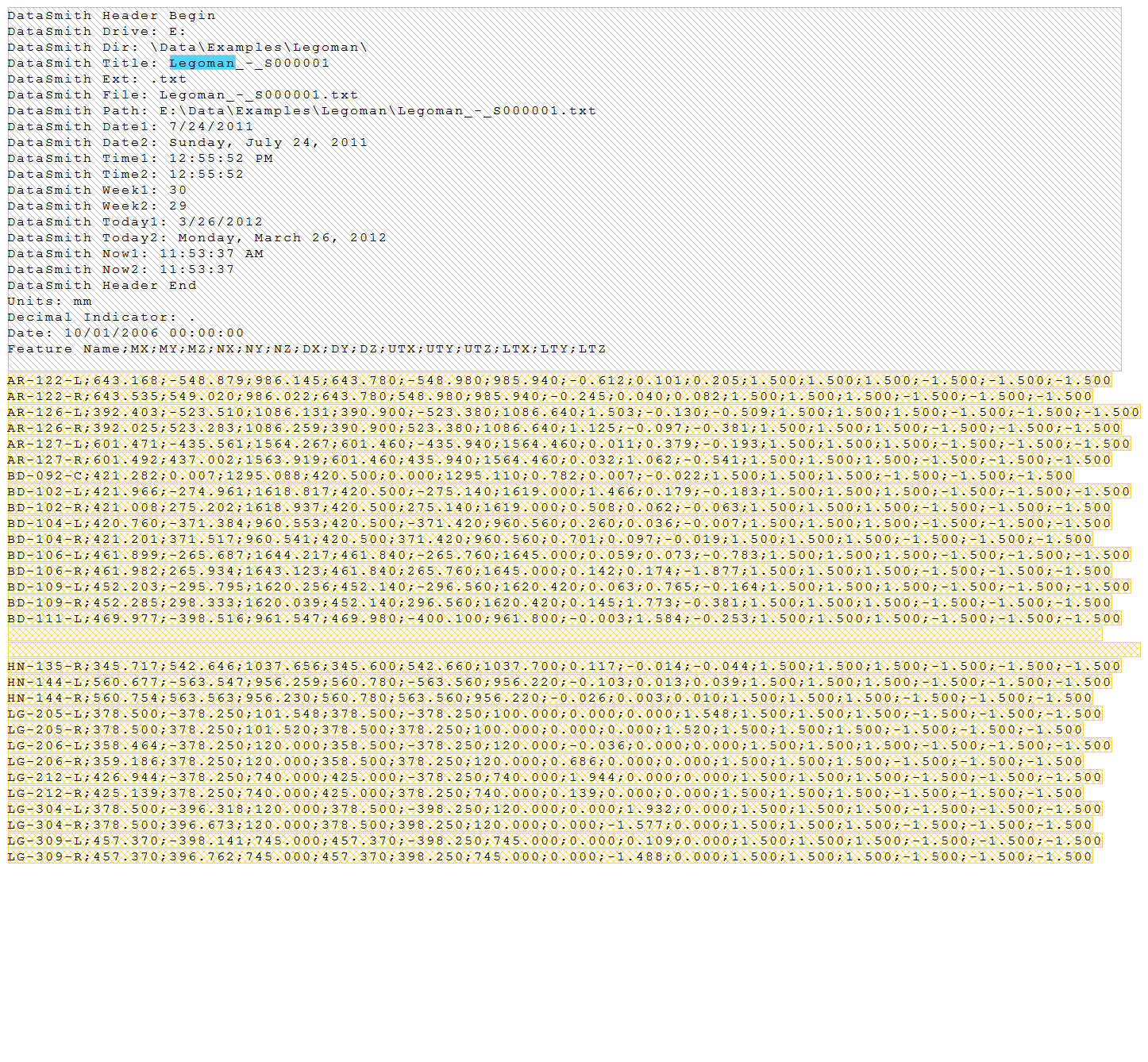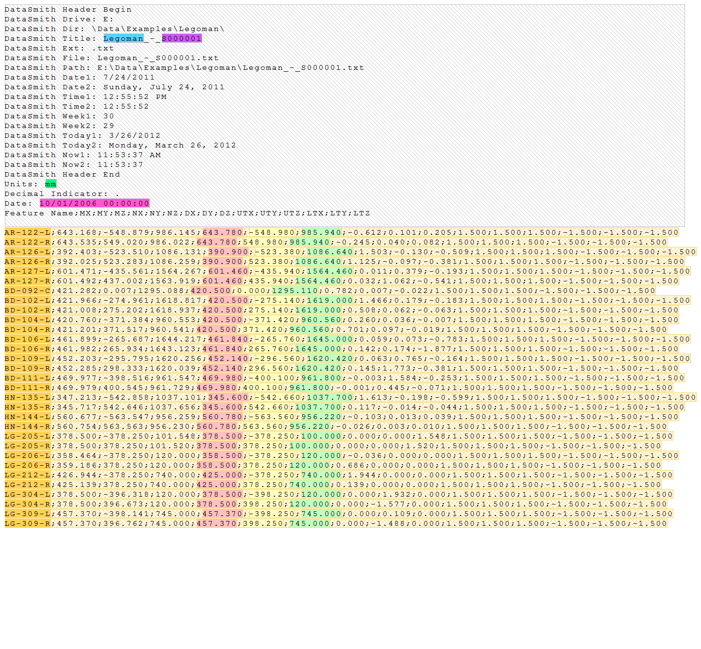 Below are screen captures of what the file highlighting and the grid in DataSmith will look like once all of the steps have been completed for the Legoman configuration. Compare the screen captures to your finished results to confirm that all of the steps were completed successfully.
