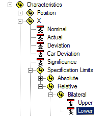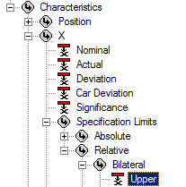 Select the association Feature>Characteristics>X>Specification Limits>Relative>Bilateral>Lower.