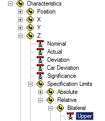 Select the association Feature>Characteristics>Z>Specification Limits>Relative>Bilateral>Lower.