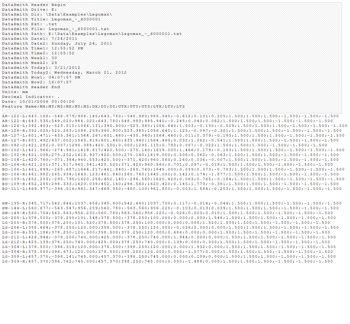The "LegoMan" data files are *.txt files based on the format of data exported by a CAM2 Q measurement device. The configuration created to read that type of data allows all nominal and measurement data to be read into the database at the same time using a single configuration.