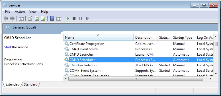 While CM4D Scheduler is still selected in the column, click the Start link above the description panel on the left hand side of the Services dialog.