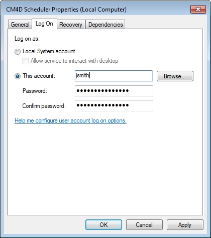 Enter the Window’s User who will be running the CM4D Service. Click the Browse... button to verify the username.