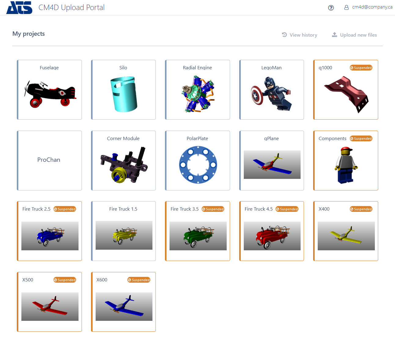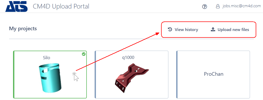 The main landing page of CM4D Upload Portal is the Project page. Available Projects are shown in tiles with either a title or a title and image to identify the project. Individual project availability is dependent on the logged in users' assigned role in ATS Security Manager.
