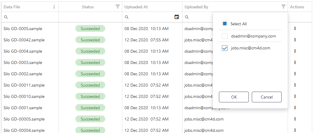 | Uploaded By | The user that uploaded the file. Some users will only see their own uploads, whereas others may have access to see all the users that uploaded files to a project. |