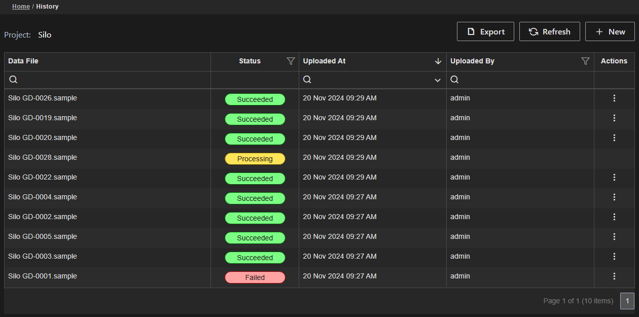 Each Project tracks the history of all files that have been uploaded. The history displayed is dependent on the security role of the logged-in user. The columns of the grid can be searched and sorted.