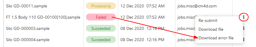 | Status | Indicates the current state of the upload (Submitted, Processing, Retry, Failed, Succeeded). The status is refreshed automatically without reloading the page. |
