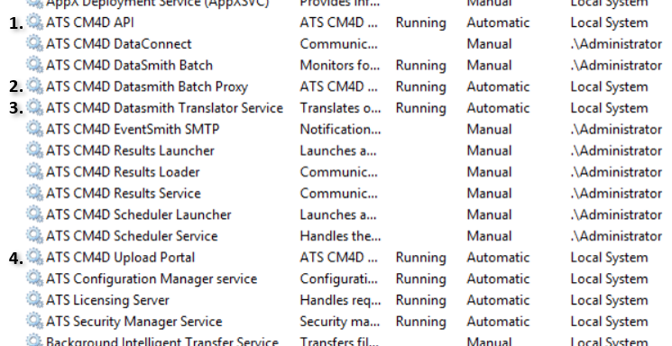 These services do not have any special user log on requirements. All of these services depend on a connection to the ATS Security and Configuration Manager, whether local or remote.