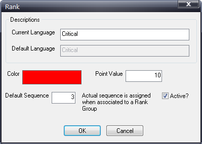 Be sure that the text description (seriousness of the rank) accurately reflects the point value that you assign to it. This value provides critical data for Inspect Reporting, which uses rank filters to allow a report user to view reports for only specific ranks.