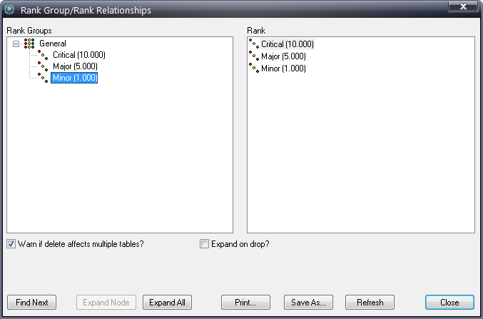 6. To assign ranks to a rank group, click Defects > Rank > Rank Group/Rank Relationships.