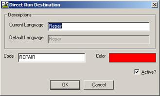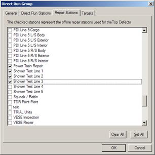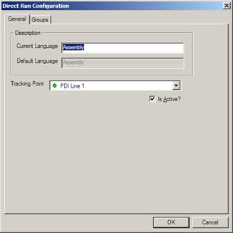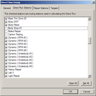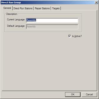 When adding or editing a Group, the Direct Run Group dialog will be displayed. There are four different tabs: General, Direct Run Stations, Repair Stations and Targets.