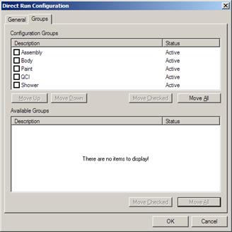 An important part of Direct Run is the capability to create custom configurations. This allows for different groupings (and master tracking point) based upon need. For example a user might want a complete plant breakdown with groups such as Body, Paint, Assembly, and Inspection. They might also want a single department breakdown for Paint such as E-coat, Enamel, Inspection, and Repair. By allowing multiple configurations, such scenarios are easily supported.