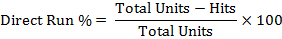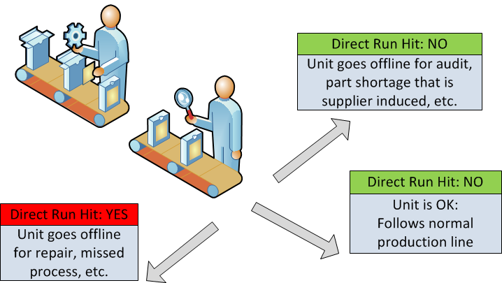 These destinations are considered to be either "hits" or "no hits". A "hit" indicates a bad unit. This could be because the unit has been taken offline for repair or because of a missed process. If a unit is taken offline but there is no "hit" to the direct run it is because the unit has been taken away for auditing, because of parts shortages or for other reasons where there was no error in the product itself.