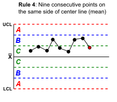 Nine consecutive points fall on the same side of the centerline (in zone C or beyond). |