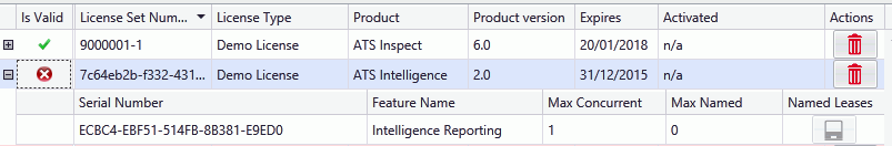 If there is an issue with license validation, a red X is shown at the beginning of the row. Selecting the license will display the license details in the License Properties pane and the issue will be highlighted in red.
