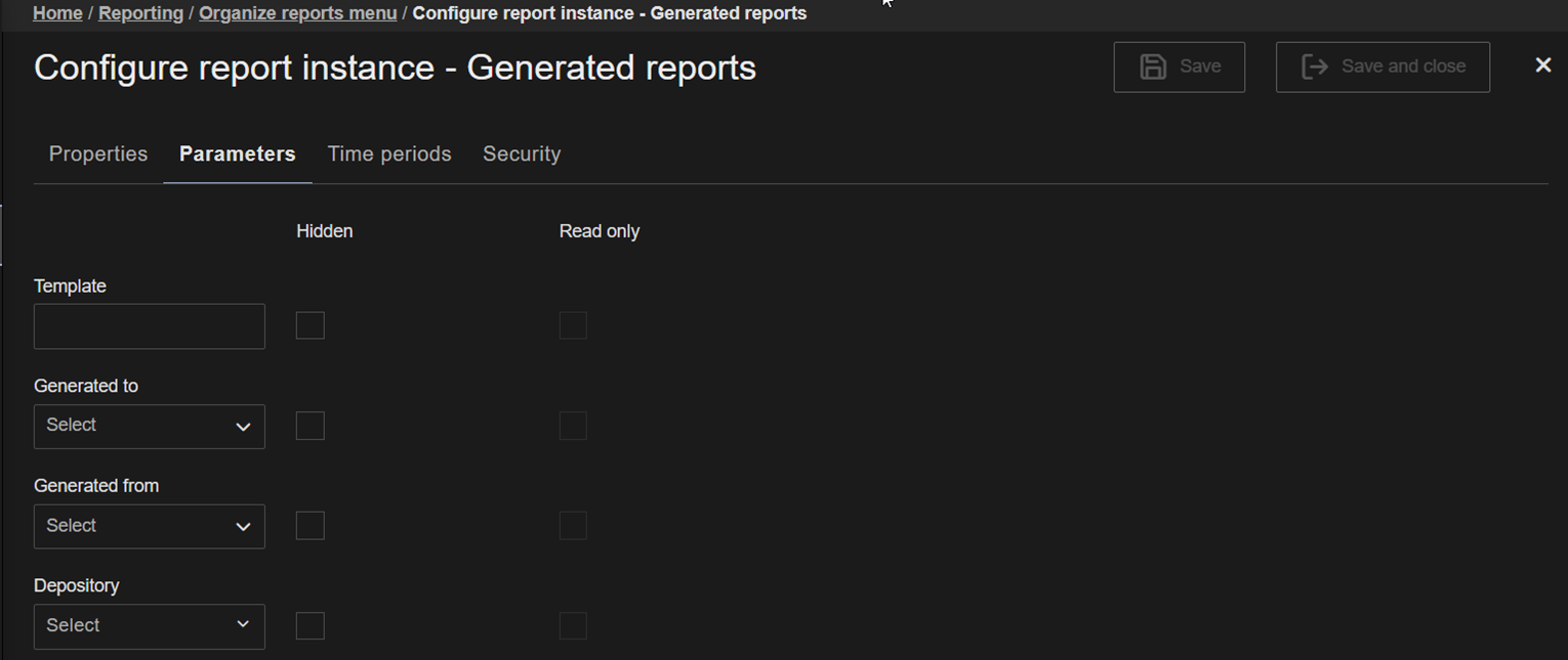 When clicking the Save and close option all the entered data is saved, the blade is closed, and the user is redirected to the Organize reports menu blade.