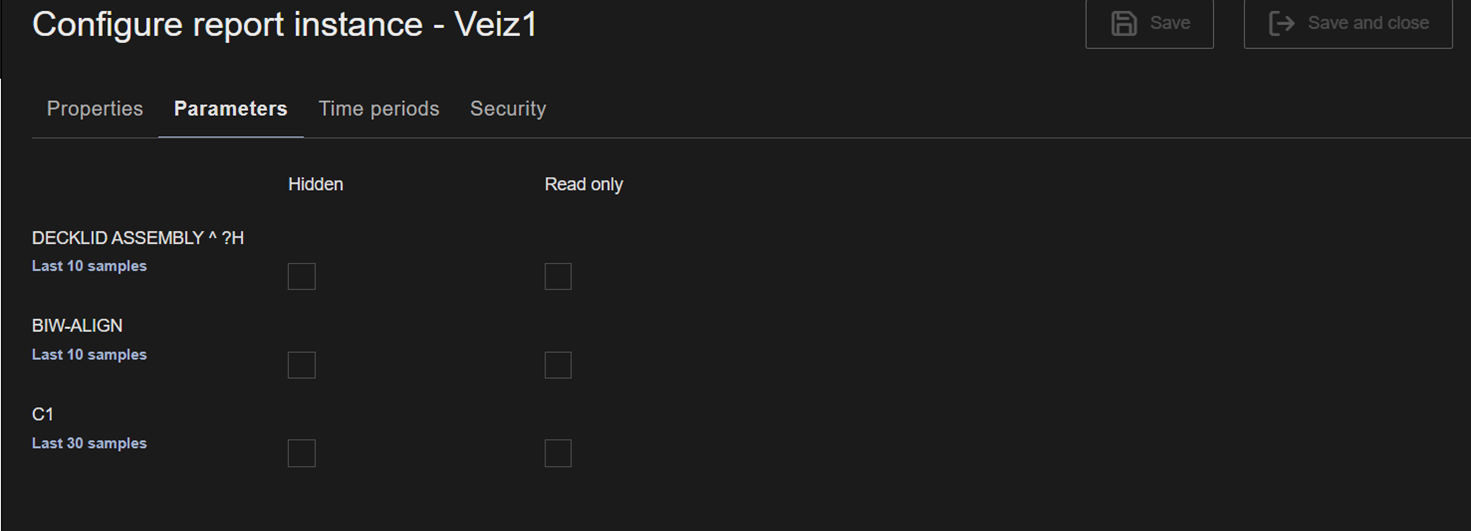 The Parameters tab becomes active. All available report parameters are loaded and any previously configured parameter values are shown. There is a read-only check-box for each parameter in the Parameters tab.
