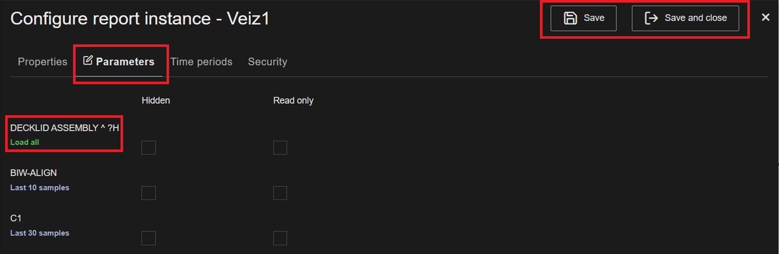 The Parameters tab becomes active. All available report parameters are loaded and any previously configured parameter values are shown. There is a hidden check-box for each parameter in the Parameters tab.