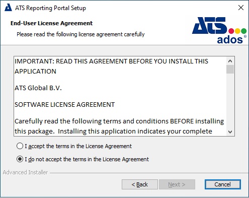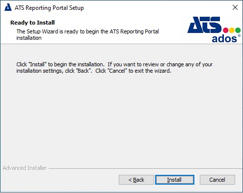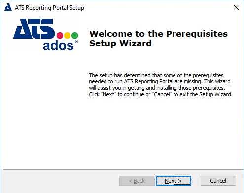 Follow the installation process for each prerequisite. Once complete the Welcome to the ATS Reporting Portal Setup Wizard screen will be displayed.