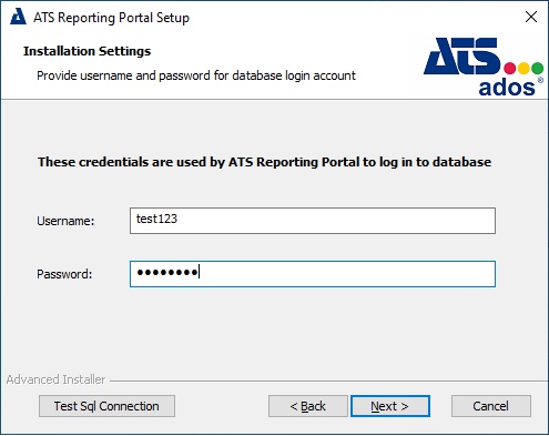Enter a username and password to be used for the ATS Reporting Portal database. If the credentials specified do not currently exist, they will be created by using the credentials from the previous step and assigned as Schema Owner. Press Next.
