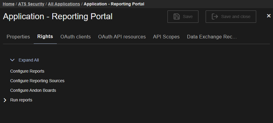 Please note that the Configure Reports, Configure Reporting Sources and Configure Andon Boards rights will only be available once the ATS Reporting Portal has been installed. Please click here.