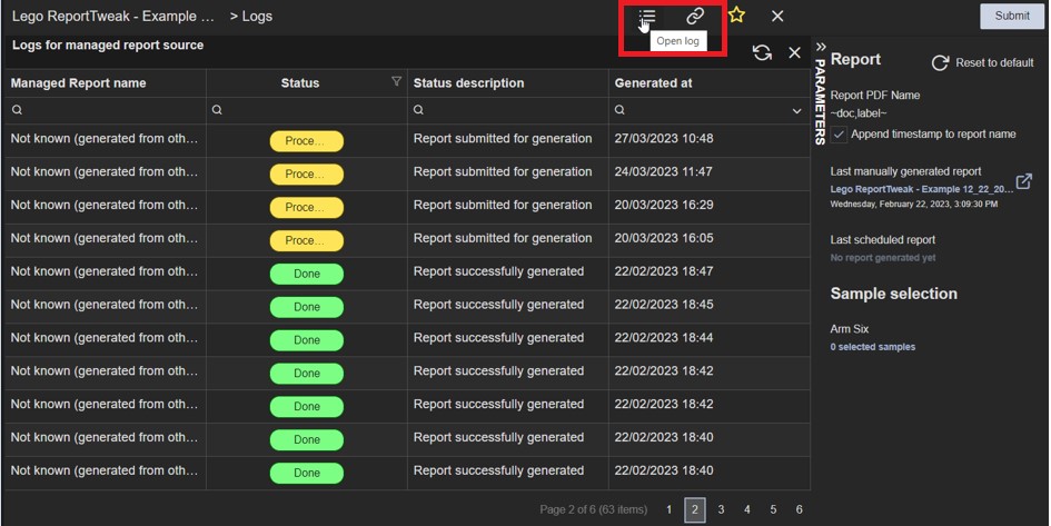 The Open log button diplays a list of logs for managed report sources in a grid.