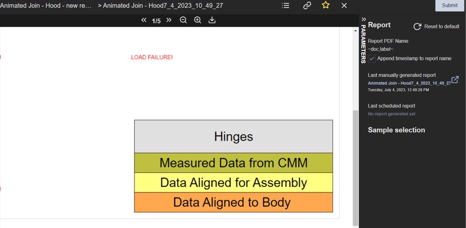 The Submit button is used to send the report out to be populated with the latest data and generate the PDF. A log entry will display the status of the submitted report.