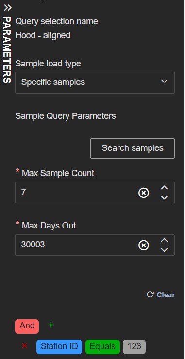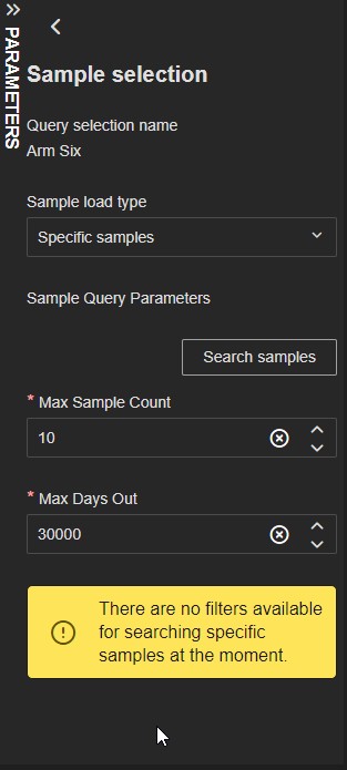 The Specific samples type has two fields: Max Sample Count and Max Days Out with default values at the source level. If there are no filters available for searching a message is shown.