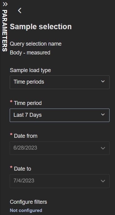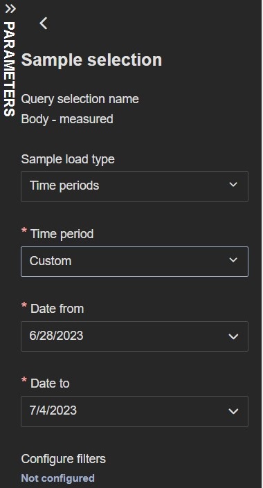 The Time periods sample load type presents three fields: Time period, Date from and Date to. The Date from and Date to fields are enabled only if you choose Custom in the Time period field. Filters can also be added under Configure filters.