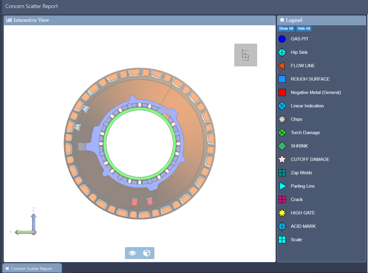 Inspect CAD reports have an interactive view where you can see the defects and the information for the defect, as well as legend for selecting the type you would like to be shown.