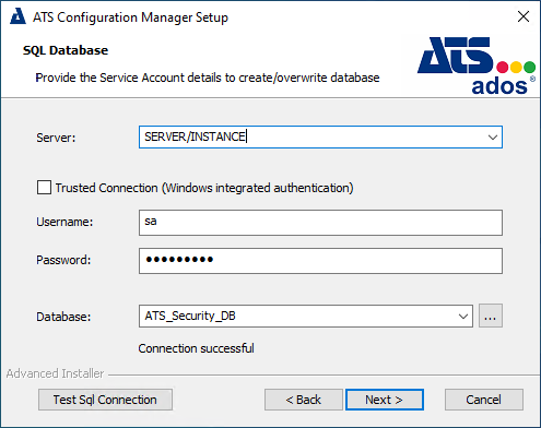 Before you start the installation for ATS Security and Configuration manager make sure you have access to MSSQL Server instance that has enabled Windows and SQL Authentication.