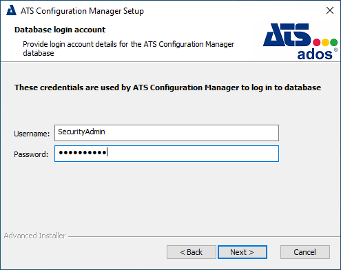 Enter a username and password to be used for the ATS Security database. If the credentials specified do not currently exist, they will be created by using the credentials from the previous step and assigned as Scheme Owner. Enter a username and password to be used for the ATS Security database. If the credentials specified do not currently exist, they will be created by using the credentials from the previous step and assigned as Scheme Owner. If the database is an Azure SQL Server, the database user specified in this step must be previously created and configured with the db_owner role. Press Next.