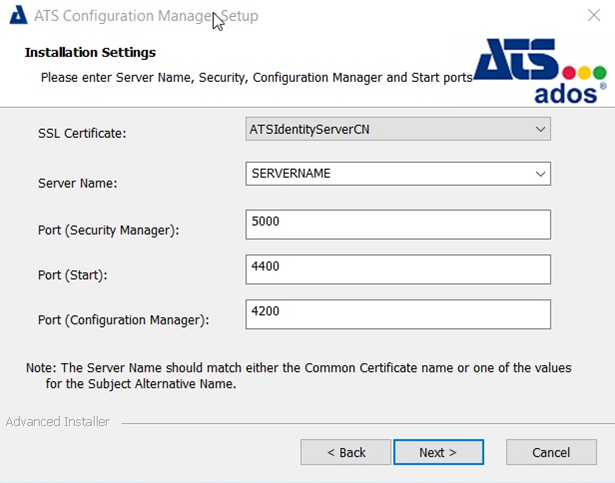 Server Name: Enter the name of the machine that hosts the ATS Security and Configuration Manager.