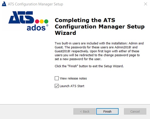 If the Launch ATS Start check box was ticked in the previous step, a browser window displaying the ATS Security login page will be loaded.