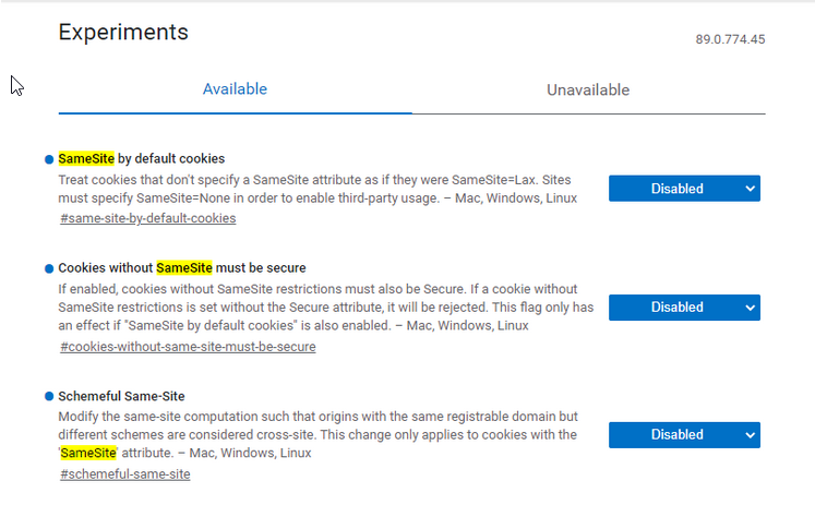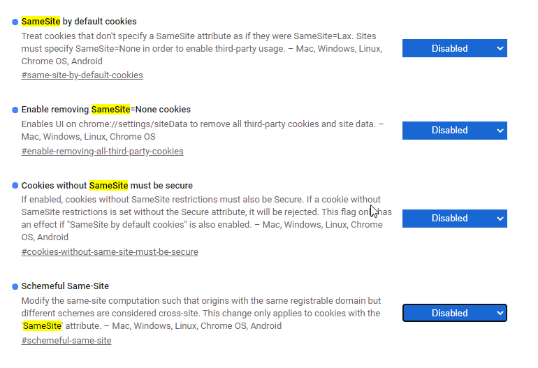 In the search box type "samesite" and you will be displayed with the following options