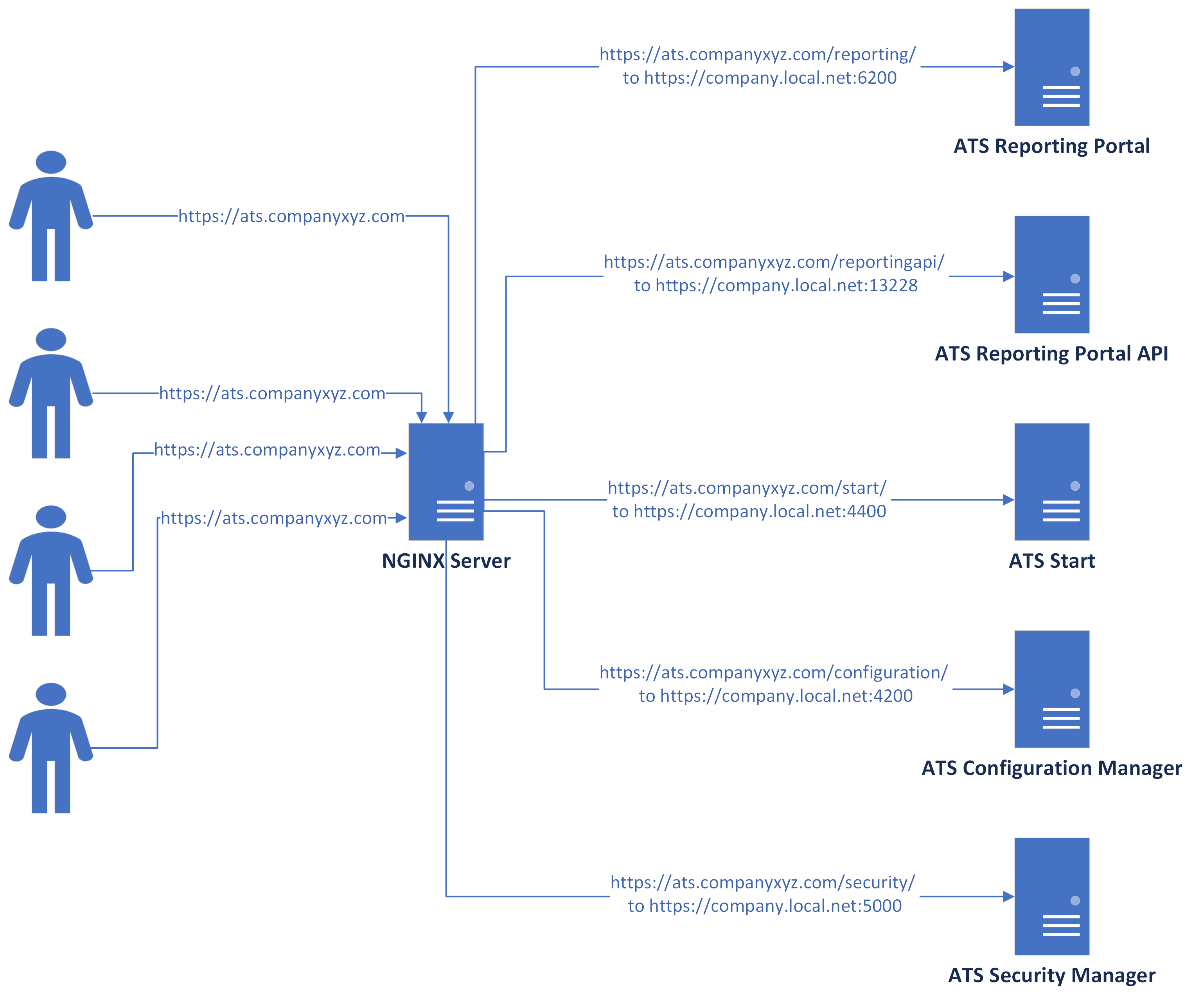 ATS Security Manager, ATS Start and ATS Configuration Manager work as self-hosted services deployed on a server running on specific ports. On occasion, port maintenance can be an issue for some security policies and reverse proxies are used.