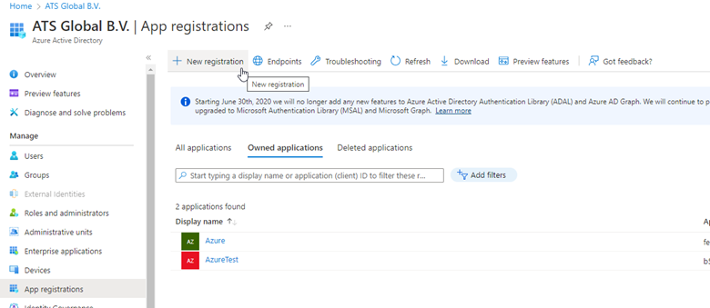 Add a new application registration by clicking on the New registration link (button).