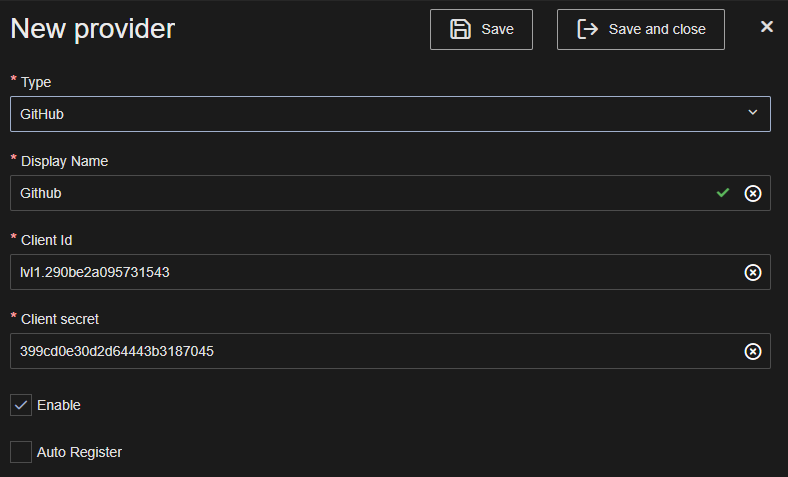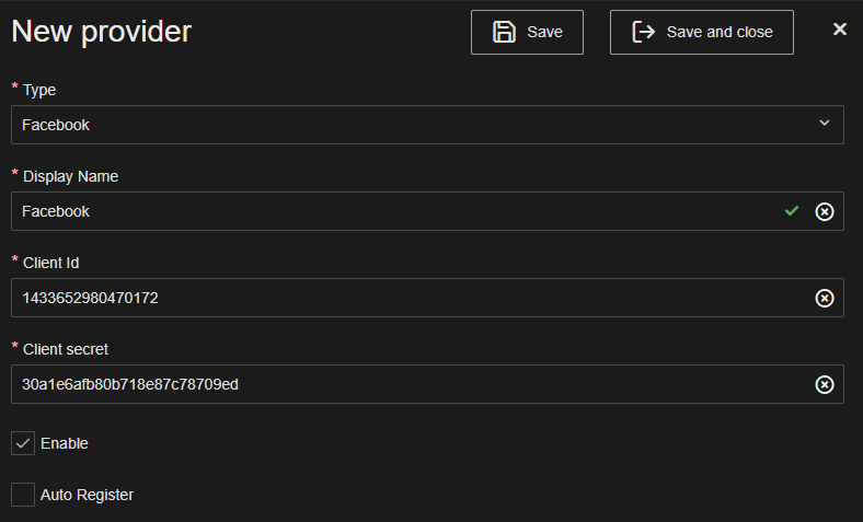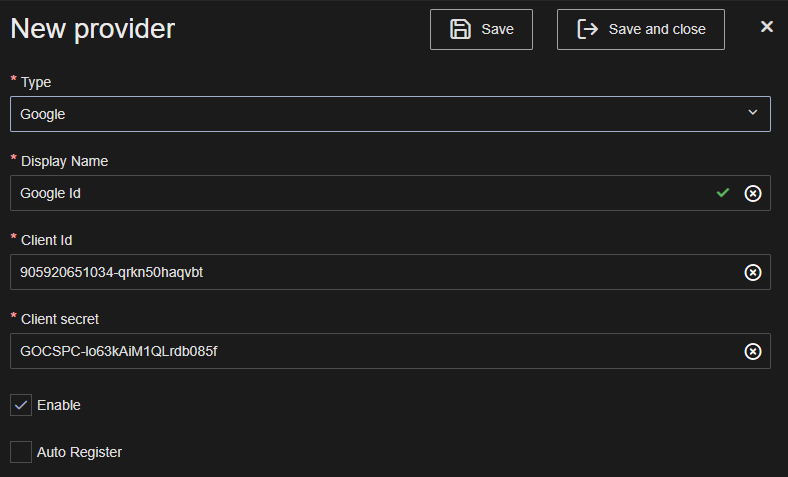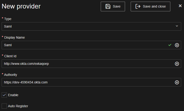 Ensure that the provider Is enabled and click Save or Save and close.